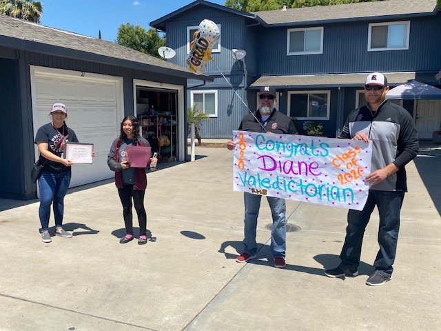 RHS Valedictorian Diane Mabel Murillo had a 4.09 GPA and was surprised by Senior Counselor Maritza Alvarez, the Campus Monitor, and RHS Principal Greg Diaz at her home with a balloon and banner for her accomplishment. Although she was caught off guard her parents and two sisters knew all about it as she was at home preparing for her AP econ exam.