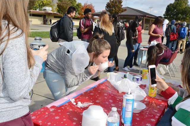 The Leadership Class was originally going to set up the activities indoors due to the rainy weather, however with the sun shining between the puffy clouds they set up shop outdoors. There was a photo booth indoors that was decorated as a winter wonderland with snowflakes, pine cones, and lights along with a box of props to make the photo a little more amusing.