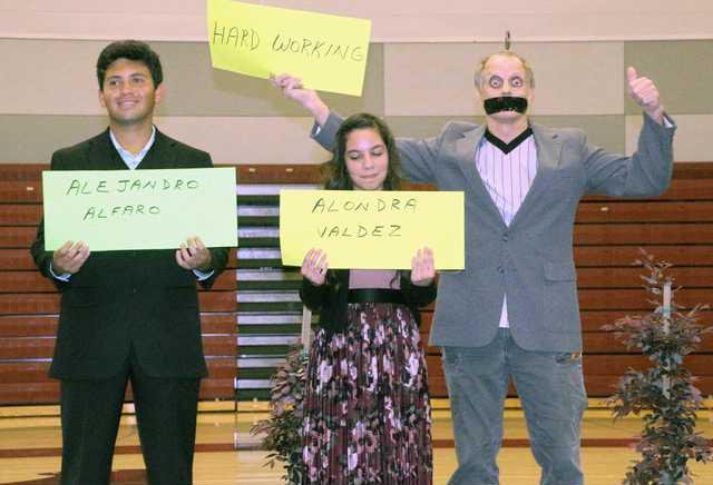 Instructor Kevin Hejnal impersonated ‘Tape Mouth,’ an entrant in last year’s America’s Got Talent competition on TV. The audience agreed he remained true to TM’s style in his presentation but was still able to honor both juniors Alejandro Alvaro and Alondra Valdez. Hejnal noted, with title cards, Alvaro is headed to UC Irvine to study Medicine, while Valdez expects to attend UC Davis to study Rehab Nursing.