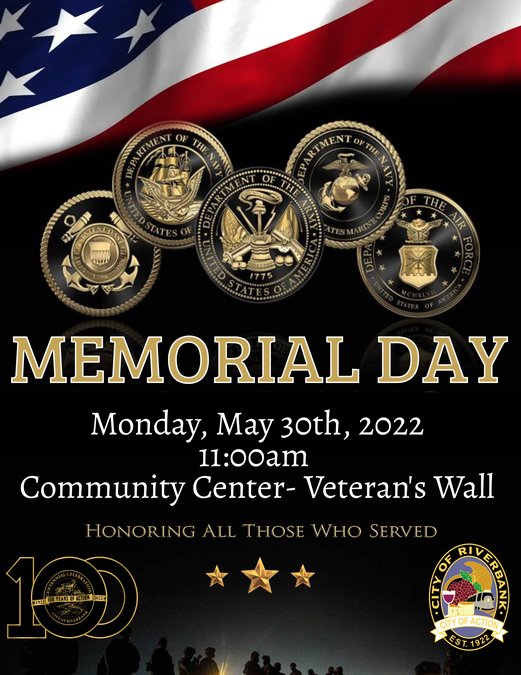 In commemoration, the City of Riverbank will be presenting a Memorial Day observance honoring all those who served to remember those who have given the ultimate sacrifice, pay tribute to those living who have served, and to honor those currently serving to protect our nation and our freedom.