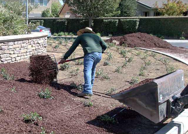 A crew from Grover Landscaping was finishing up the conversion of the grass area on the roundabout from grass to ground cover. The week before, the old, dead grass was removed, and the irrigation system redone, using a drip system grid.