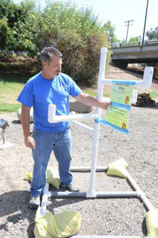 There is a life jacket station that was custom-made by Tim Dowdy, the City of Riverbank’s Park Supervisor, put together with old spare parts that now stands empty at Jacob Myers Park.