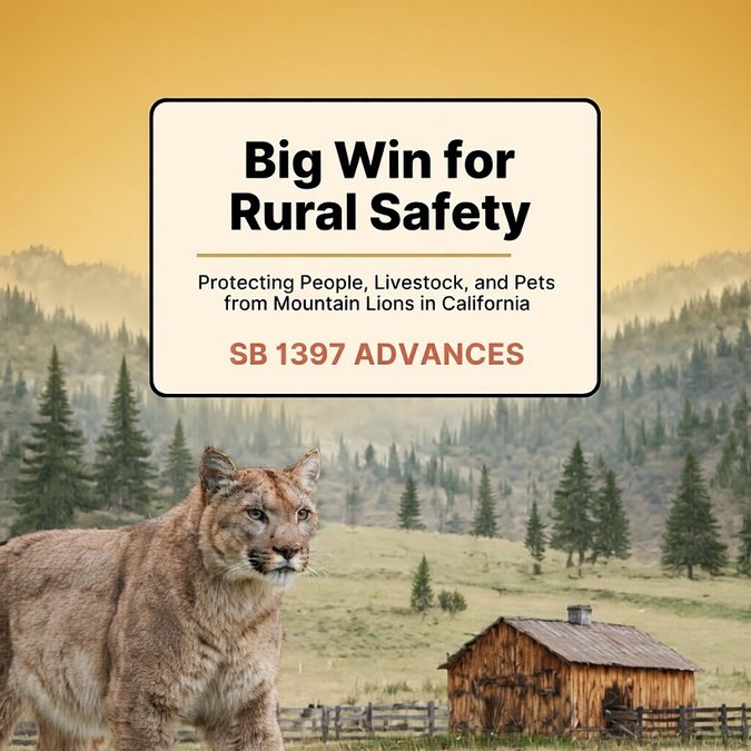 Earlier this month, area Senator Marie Alvarado-Gil (R-Jackson) saw her Senate Bill 1397 clear the Senate Natural Resources and Water Committee, delivering a major win for rural communities across Senate District 4 and strengthening protections for people statewide against dangerous mountain lion conflicts.