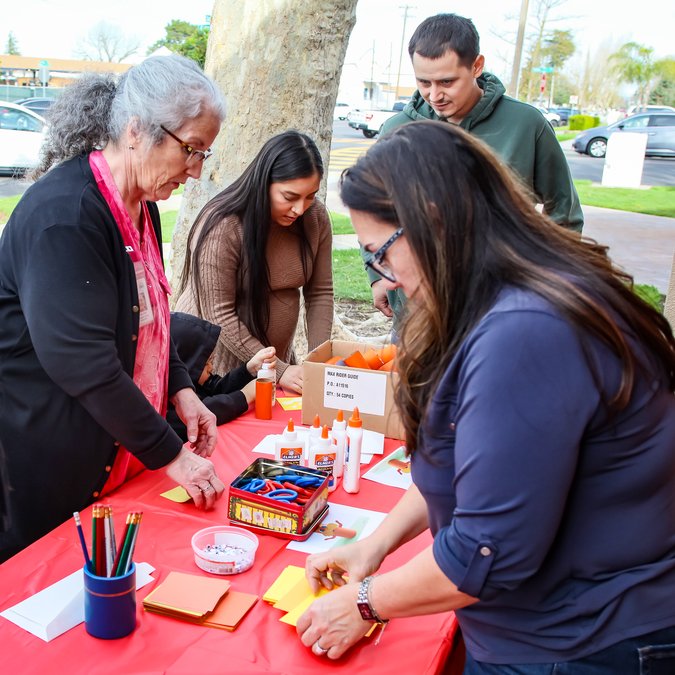 Librarian Vicky Holt, left, along with kids, parents and staff members gather around one of two crafts stations set up outside the Riverbank Branch of the Stanislaus County Library on Santa Fe Street. The March 5 craft event was part of the local library’s celebration of Dr. Seuss’s birthday. Here, they were encouraged to make their own Lorax character. There were also some guest readers stopping in at the library to share a Dr. Seuss book with youngsters.