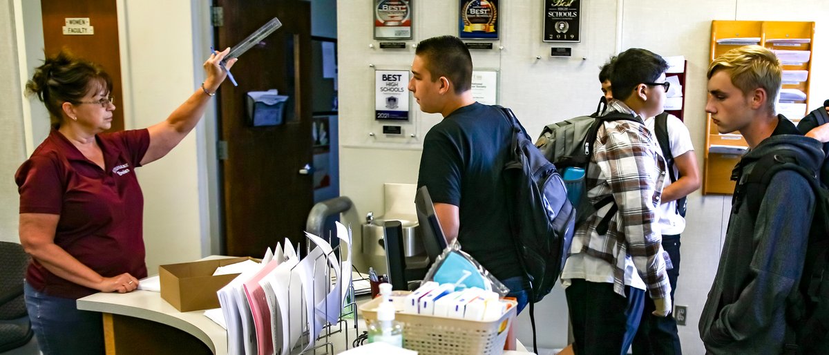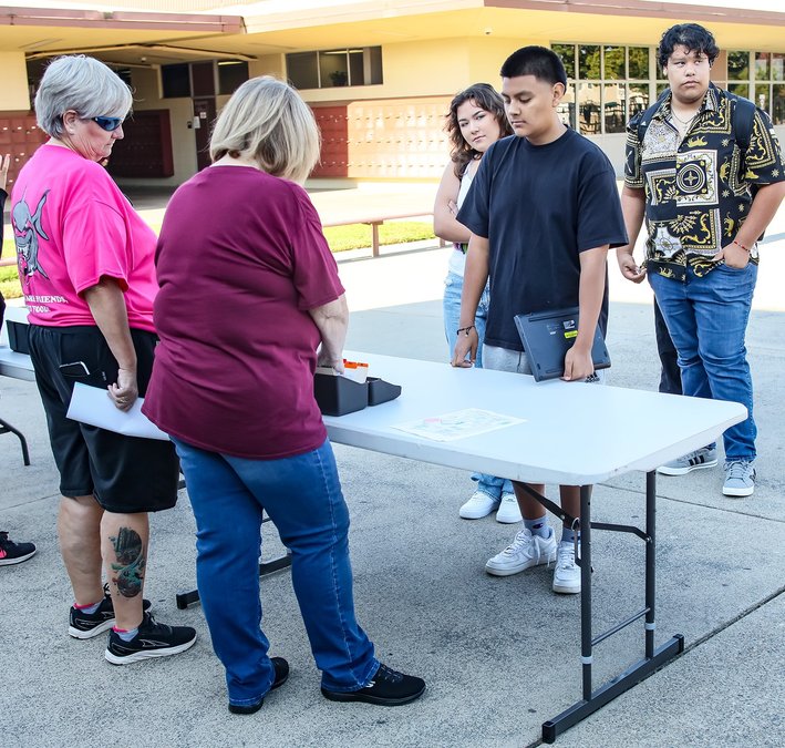On the RHS campus, returning students were to have checked the district’s online website, Aeries, for their class schedules. Freshmen and other new students were lined up in front of tables in the quad in front of the library to receive their class lists as classes got underway.