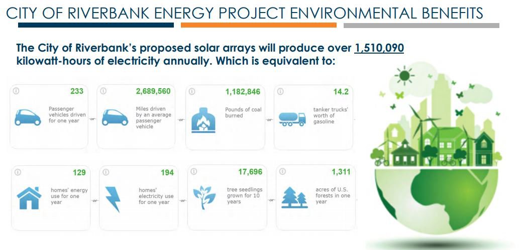 During the City’s strategic planning session it was discussed to have new innovative energy efficiency and micro grid projects within the City of Riverbank. It was stated in the summary of the agenda item that over several years the city staff has met with a number of companies that provide those energy efficient solutions. The proposed projects have been large scale projects which included large dollar amounts and solar locations that were not reasonable. During the presentation the proposed sites for solar that were discussed included the Community Center parking lot, Riverbank Police Services parking lot, Whorton Park and the Wastewater Treatment Facility.