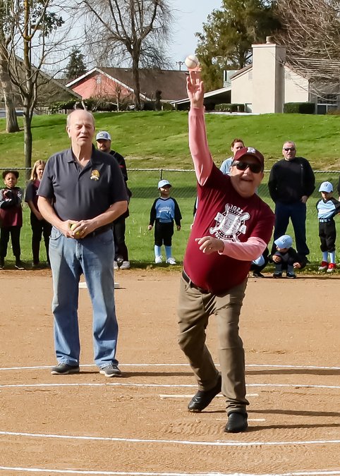 Taking his turn in the pitching circle first was local businessman Daryl Daniel of Sno-White Drive-In, who had the honor of throwing out the first pitch for baseball. Then, it was Riverbank Mayor Richard D. O’Brien’s turn, and he stepped into the circle to send the first pitch for softball toward the plate.