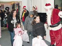 They came and continued coming until close to the scheduled closing at 7:30 p.m., when a group of some 30 or 40 people who had not pre-registered and had been waiting patiently were also allowed into the building and received plastic bags of toys besides a hug from Santa and extras like candy canes and bags of peanut brittle.
