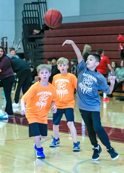 Riverbank youngsters have progressed to the game portion of the annual Youth Basketball clinics hosted at the high school, with games starting this past Saturday. The older kids competed on the full-sized court in the Fauria Gymnasium, with these squads facing off with each other around midday. These two particular teams are sponsored by Denair Lumber, in orange, and Pizza Plus, in blue. Several age levels are featured and, after a couple of weeks of instruction in the basics of the game – helped out by Riverbank High School boys and girls basketball players and coaches – the young hoopsters enjoy several weeks of Saturday game action.