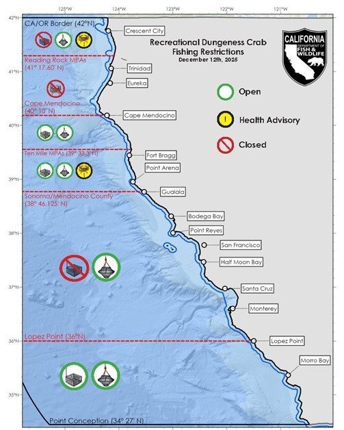 Following the recommendation from state health agencies, California Department of Fish and Wildlife (CDFW) Director Charlton H. Bonham declared the recreational Dungeness crab fishery open in Del Norte County, Mendocino County, and parts of Humboldt County. The remaining area within Humboldt County continues to be closed due to elevated levels of domoic acid.